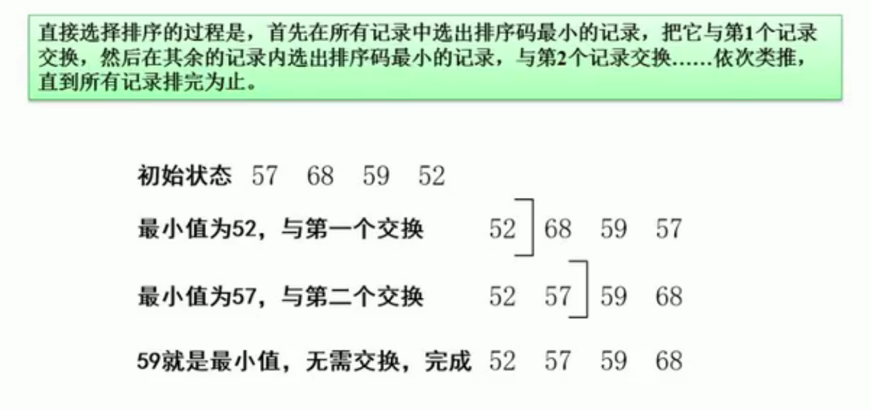 - 找最小:在当前及后面的元素中,找出最小的那个;