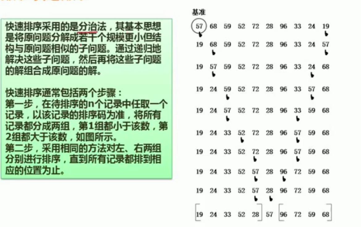 - 划分:把数组分成两部分——左边全是比基准小的,右边全是比基准大的;【注意:划分的时候要注意指针,与元素交换,两针相遇就停下】