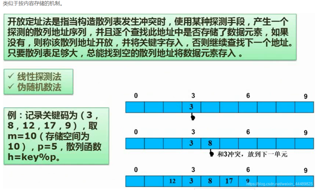 线性探测法(顺序找):三号空间被占,则将8放在三号后面的空间,即四号空间。12在二号空间,此时17本应在二号空间,被占向后移,也被占,以此类推,被存到五号空间。这又使得整体效率降低了。