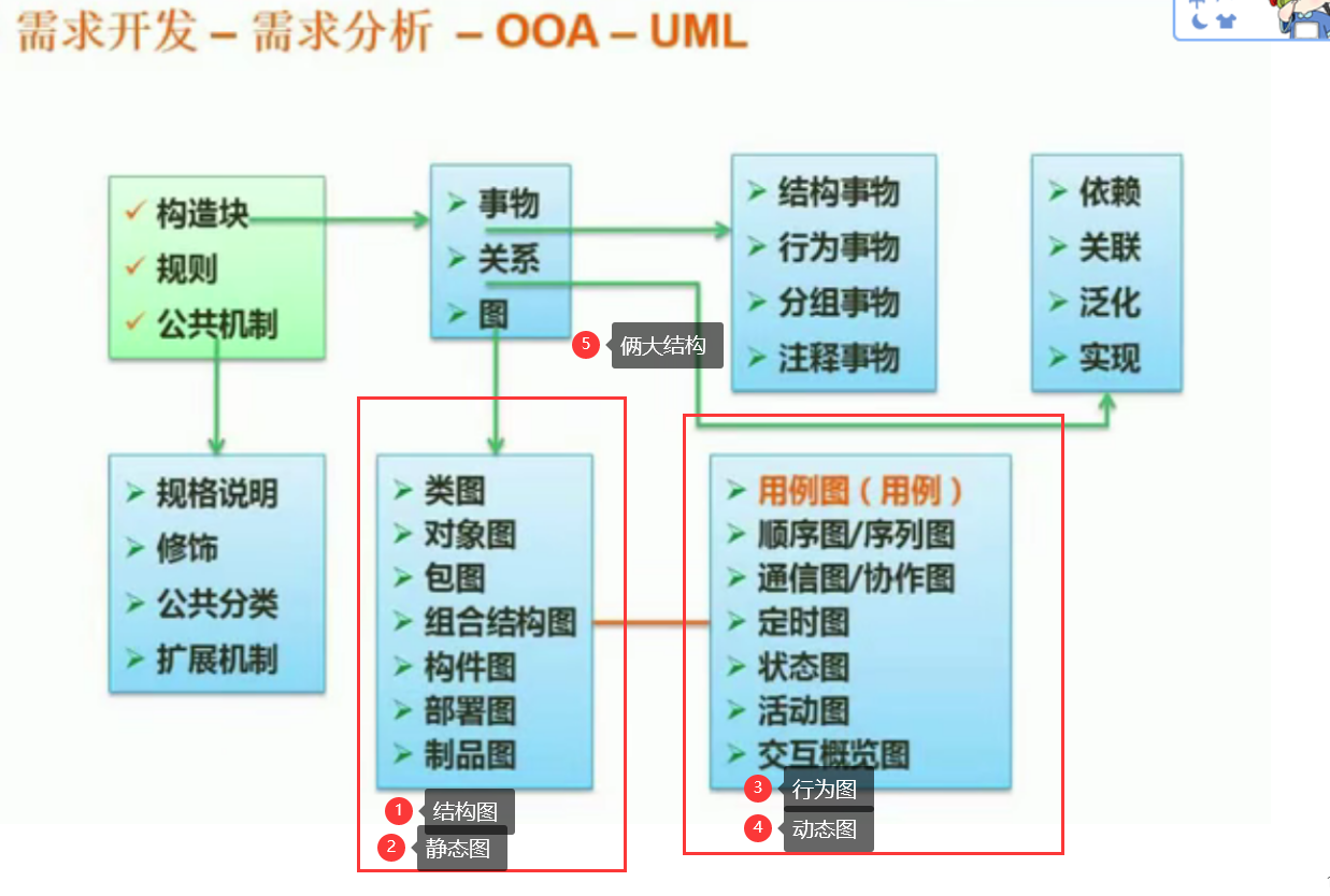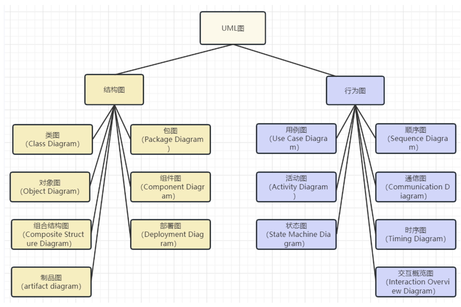 - 其中用例图不太明确,有的规定为动态(行为)图,有的归为静态(结构)图,先不要把用例图定性