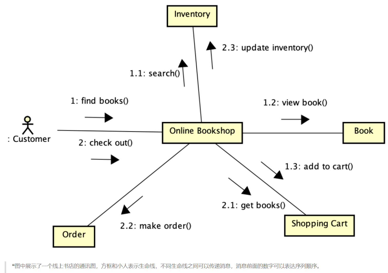 - 和顺序图类似,但更关注“对象间的联系”,而不是 strict 时间顺序。