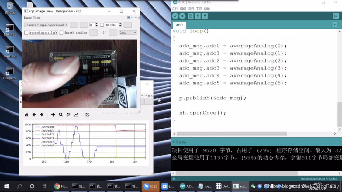 左上用手旋转调整电阻,ad口电压发生变化,左下曲线(蓝色线)实时绘制出电压图表,右侧配合代码进行讲解。