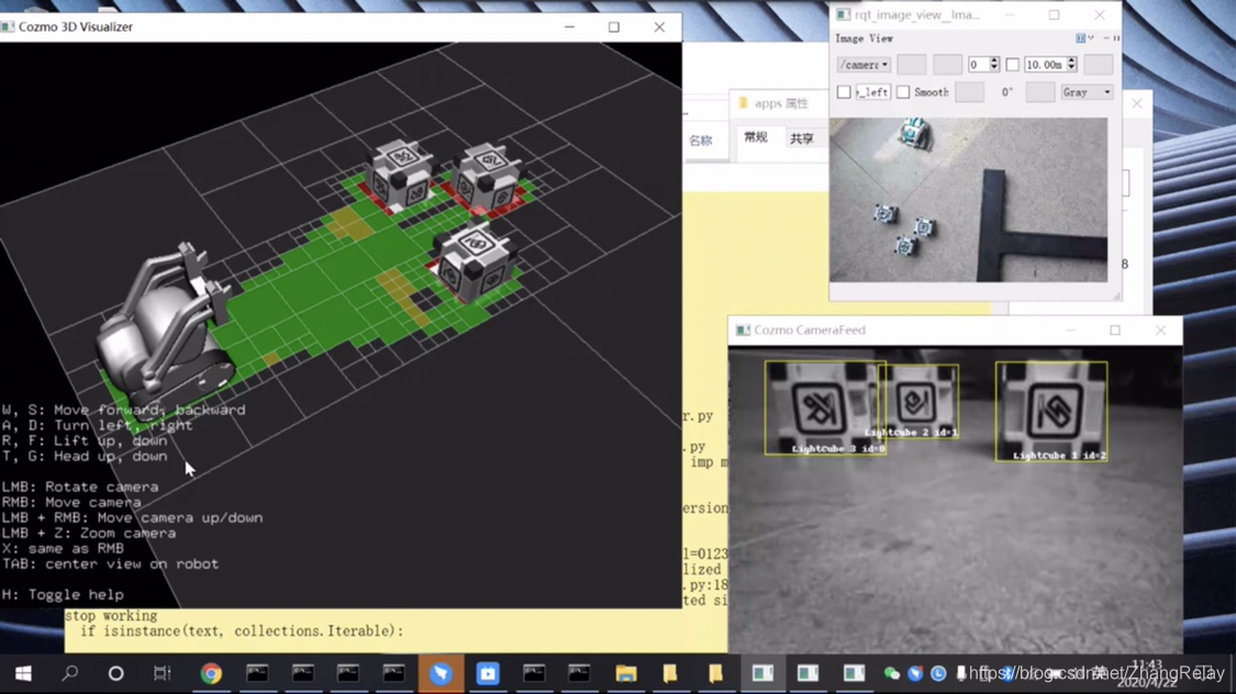 大致演示了一个机器人控制和SLAM混合效果,左侧可以通过键盘控制机器人运动,右上为俯视角度全景图,右下为机器人视觉传感器识别二维码的效果演示。通过此案例可以讲授更多内容,包括物体识别/速度闭环等各类机器人控制。同时通过直播形式让学生既能看到机器人实物,又能看到三维环境中的重构,还能了解机器人视觉信息的处理等。