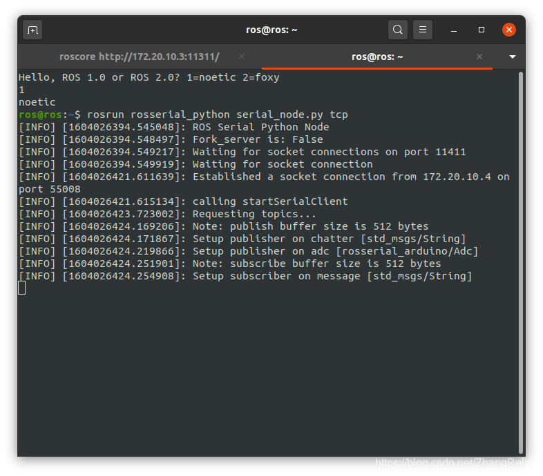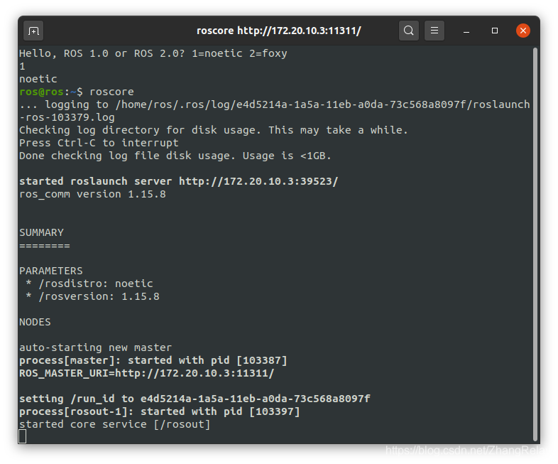 C:\ros_ws>set ROS_IP=172.20.10.3 C:\ros_ws>set ROS_MASTER_URI=http://172.20.10.3:11311 C:\ros_ws>roscore ... logging to C:\Users\zhangrelay\.ros\log\56128ade-1a25-11eb-9f50-94b86dd78b23\roslaunch-LAPTOP-5REQ7K1L-10872.log Checking log directory for disk usage. This may take a while. Press Ctrl-C to interrupt Done checking log file disk usage. Usage is <1GB. started roslaunch server http://172.20.10.3:60658/ ros_comm version 1.14.9 SUMMARY ======== PARAMETERS * /rosdistro: melodic * /rosversion: 1.14.9 NODES auto-starting new master process[master]: started with pid [12060] ROS_MASTER_URI=http://172.20.10.3:11311/ setting /run_id to 56128ade-1a25-11eb-9f50-94b86dd78b23 process[rosout-1]: started with pid [13192] started core service [/rosout]