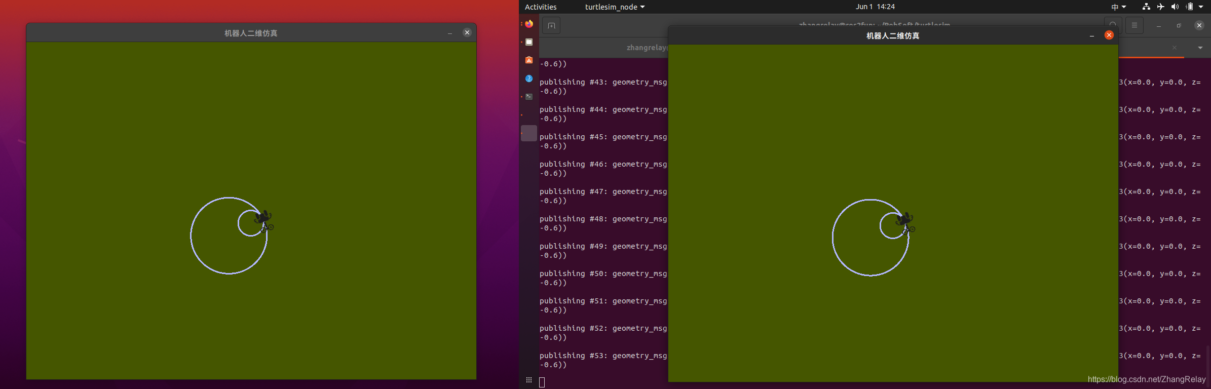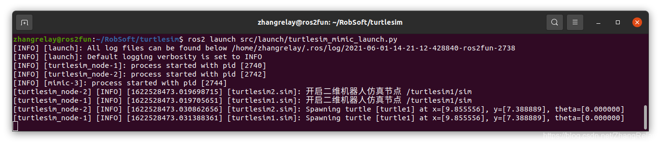 两个turtlesim窗口将打开,将看到以下[INFO]消息,告诉启动文件已启动的节点: