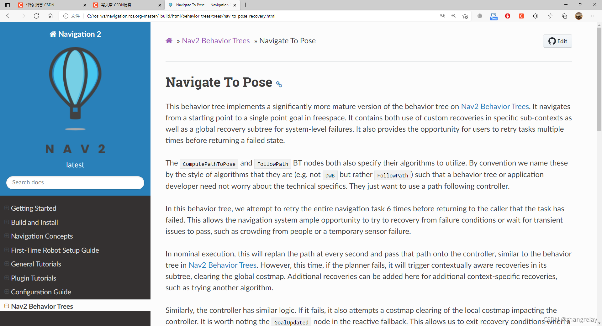 该博客主要介绍了在github上下载的ROS导航文档,编译过程中遇到问题,使用了pip3安装breathe、sphinx_rtd_theme和sphinxcontrib-plantuml等依赖。尽管文档推荐使用4.9.1版本的breathe,但博主选择了最新版,导致出现各种奇怪问题。编译完成后,网页文件位于_build/html目录下,但未详细说明编译出的具体问题和解决方案。