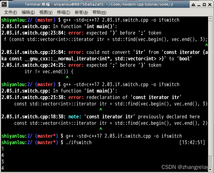 shiyanlou:2/ (master) $ g++ -std=c++17 2.03.if.switch.cpp -o ifswitch