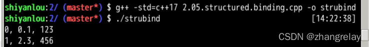 shiyanlou:2/ (master*) $ g++ -std=c++17 2.05.structured.binding.cpp -g -Wall -Wno-unused-variable -pthread -o strubind