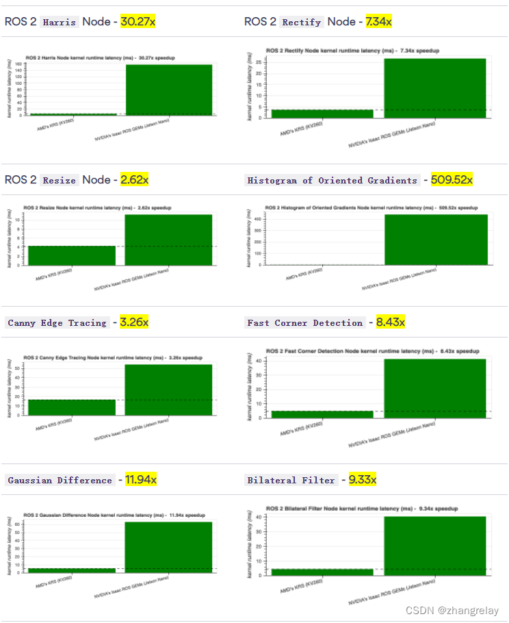 为了比较 ROS 2Nodes在 FPGA 和 GPU 加速器上的感知任务,我们选择 AMD 的 Kria KV260 FPGA 板和 NVIDIA 的 Jetson Nano 与板载 GPU。两者都提供了一些相似的 CPU(KV260 具有四核 A53,而 Jetson Nano 具有四核 A57)并且从以 CPU 为中心的角度来看具有相似的 ROS 行为。对于基准测试,我们遵循REP-2008 PR 中描述的基准测试方法。特别是,为了创建加速内核,我们利用了AMD 的 Vitis 视觉库和 NVIDIA 的视觉编程接口。例如,为了Node使用Harris Corner Detector算法比较 ROS 2 感知,我们利用[2]和[3]分别用于FPGA和GPU比较。此外,我们还会在适当的时候分别利用 AMD 的 HLS 和 NVIDIA 的 CUDA。