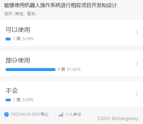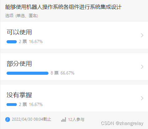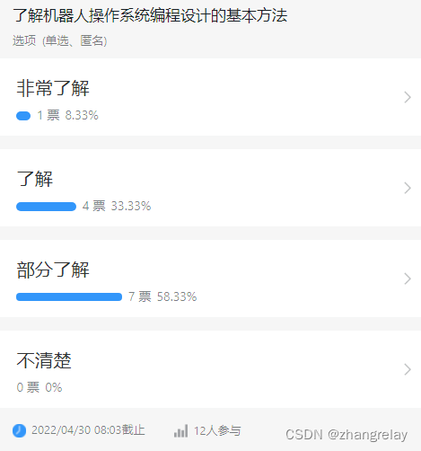 《ROS机器人程序设计》课程的学生总成绩由平时成绩、实验成绩、期中考查、期末考查成绩四部分组成,其中平时成绩占总成绩的10%,实验成绩占总成绩的30%、期中10%、期末考查成绩占总成绩的50%。 大纲规定的考核方式开展情况:按照《ROS机器人程序设计》课程教学大纲要求及该课程的教学进度表,该课程现已讲完理论课全部内容,布置了4次课堂作业。在2022年4月15日已将实践任务书发布给学生,并且要求学生在2022年6月15日前提交。 大纲规定的考核方式未开展情况:实践报告未提交,期中考查未开展,预计11周开展,计划安排在第18周前完成课程期末考试。 | |||