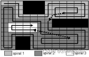 大多数覆盖算法使用两种基本结构化填充路径中的一种:螺旋或之字形路径。由于这些填充路径由明确定义和结构化的简单路径序列组成,因此很容易扩展它们以包括位于由路径填充的区域的边界中的部分被占据的单元。