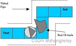 间隙序列中包含的单元包括在两个空闲单元之间通过的有效路径。然而,不可能预先知道是否必须在参考障碍物位于机器人左侧或右侧的情况下执行沿墙程序。为了解决这个问题,在参考线周围定义了虚拟管道区域。在执行避障沿壁程序时,该算法验证机器人没有退出虚拟管道;当检测到这种情况时,机器人必须在相反的方向执行沿墙程序。