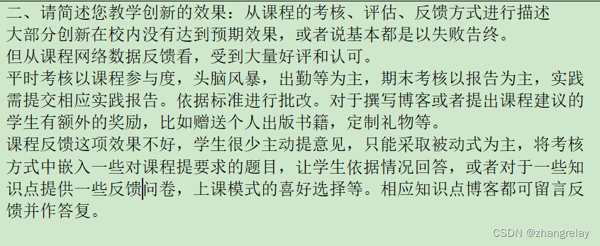 课程反馈这项效果不好,学生很少主动提意见,只能采取被动式为主,将考核方式中嵌入一些对课程提要求的题目,让学生依据情况回答,或者对于一些知识点提供一些反馈问卷,上课模式的喜好选择等。相应知识点博客都可留言反馈并作答复。
