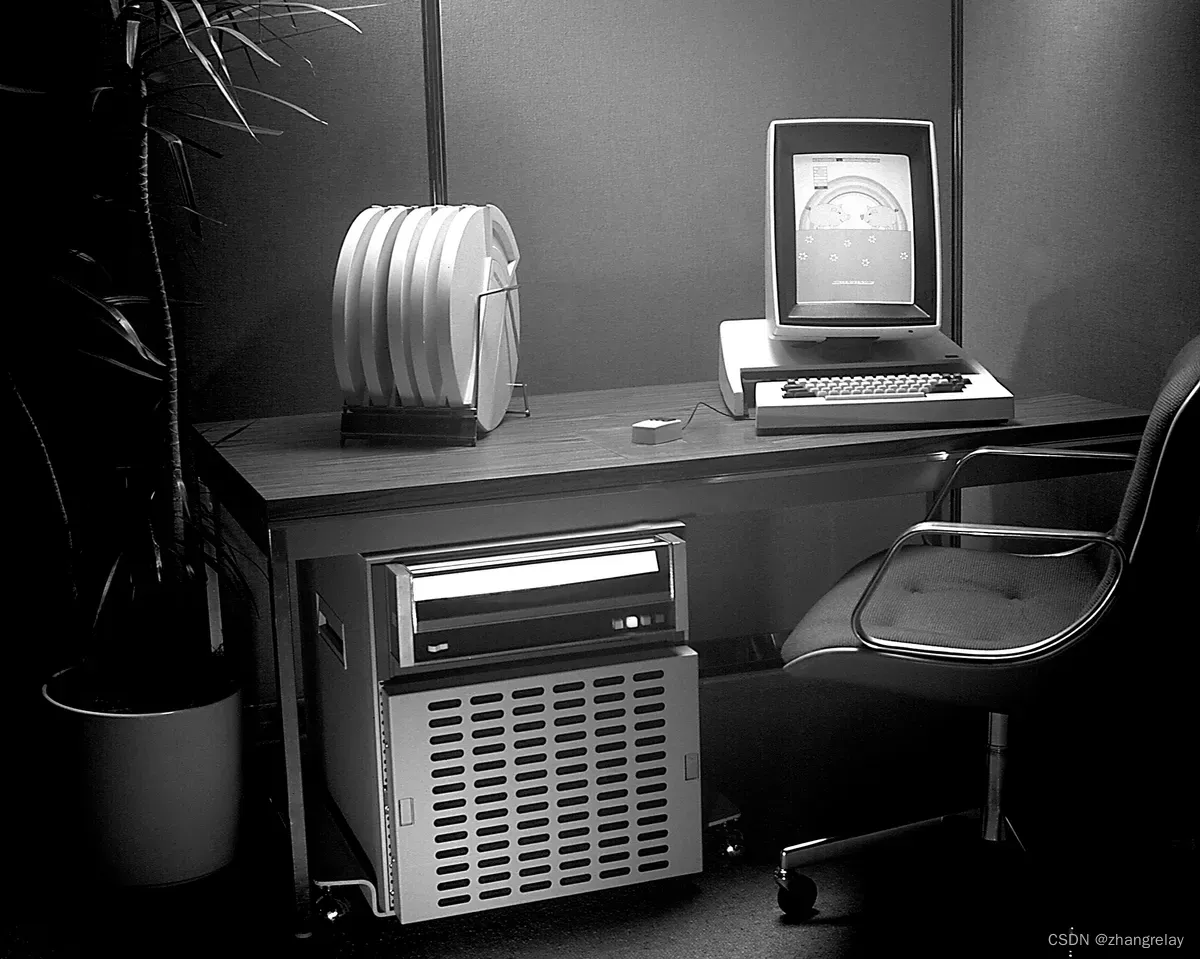 在1975年,施乐PARC的数十名研究人员在办公室里配备了个人Altos,并每天使用。这个大机柜包含一个CPU、内存和一个可移动磁盘组。桌子上还有额外的磁盘包和Alto的垂直显示屏、鼠标和键盘。PARC,一家施乐公司