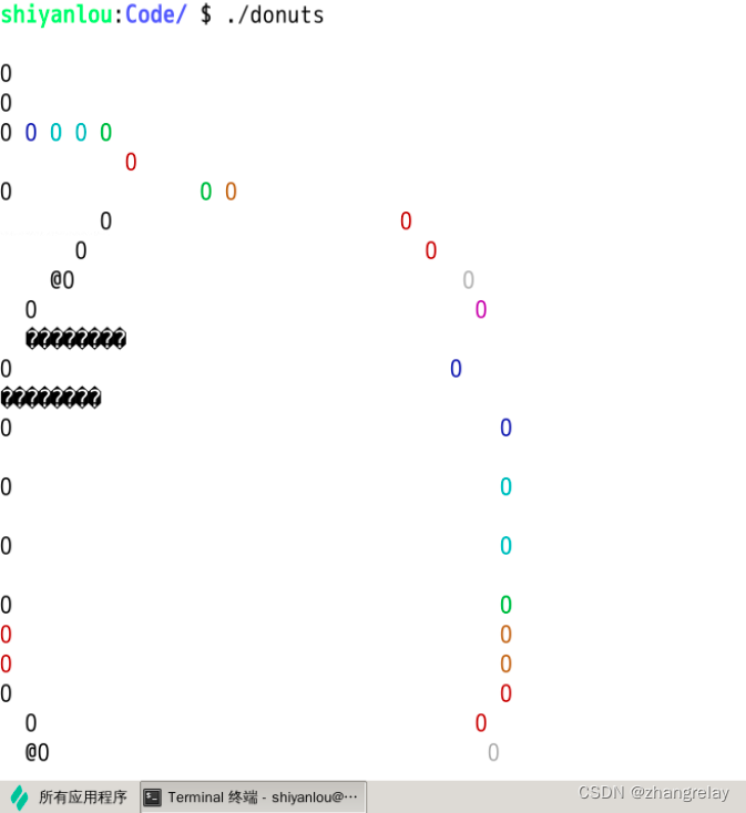 - 绘制甜甜圈:使用mvprintw()函数来在终端屏幕上输出字符,并使用attron()函数来设置字符的颜色。例如:
