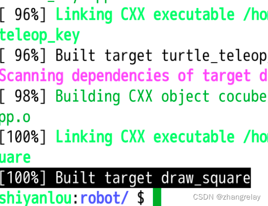 图2.3 编译没有任何问题 每一个终端都要在robot文件夹下输入: source devel/setup.zsh ,配置为自定义功能包 否则,如果不输入,则调用系统内置功能包。 新建标签页输入roscore,然后还要新建标签页输入run turtlesim turtlesim_node(注意:source devel/setup.zsh)