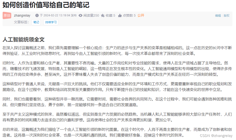 总的来说,这篇概述为我们描绘了一个由人工智能引领的新时代图景。在这个时代中,人将不再是主要的生产者,而是成为了创新者和创造者。这将是一次深刻的社会变革,也是一次充满机遇的挑战。我们需要做好准备,迎接这个新时代的到来。