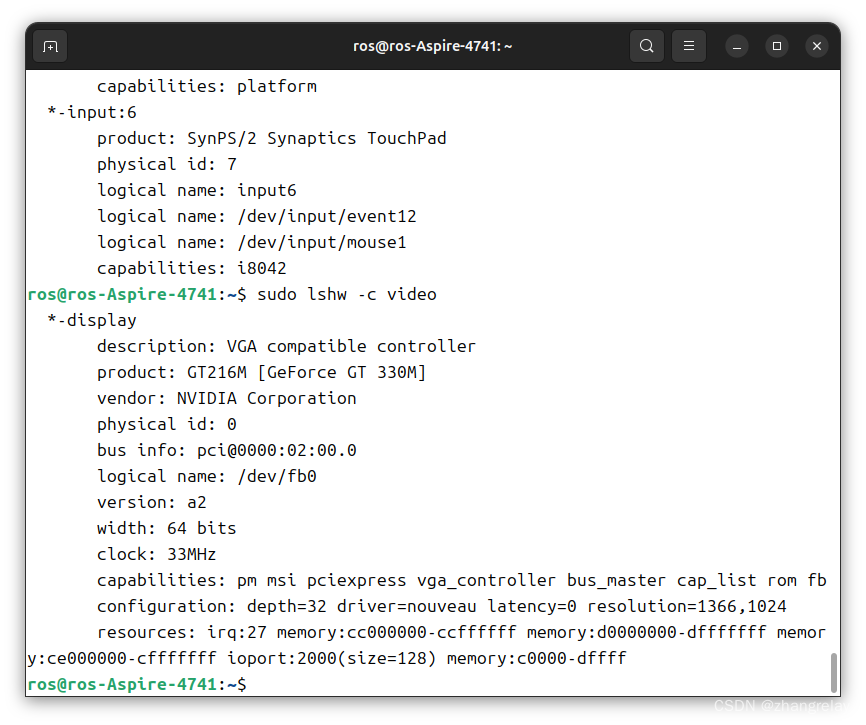 - 这描述了显卡的当前配置。深度为32表示颜色深度,nouveau是Linux上用于NVIDIA显卡的开源驱动,latency为0表示低延迟,分辨率为1366x1024。