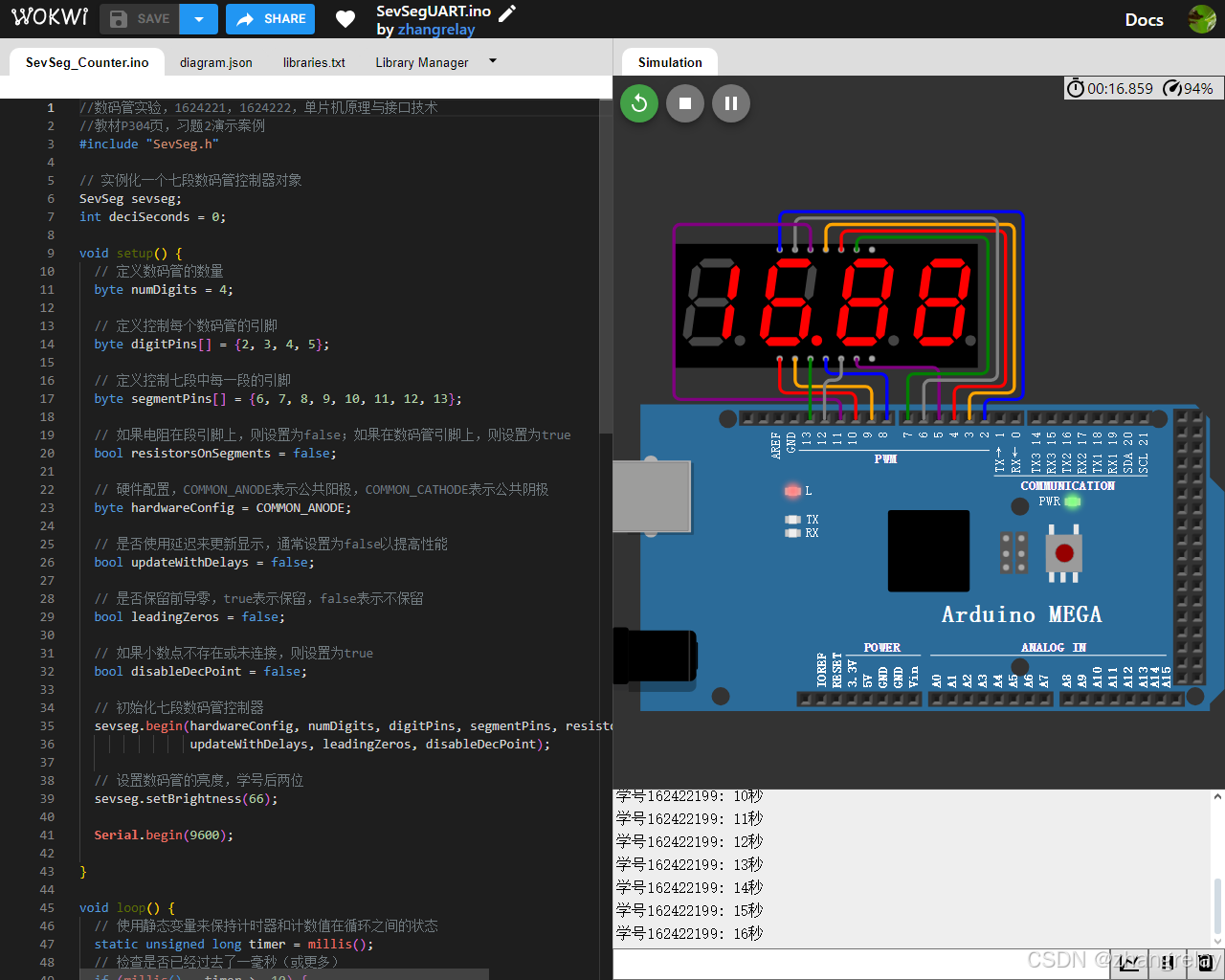 deciSeconds的命名和计算方式可能导致混淆。它实际上是以毫秒为单位计数的,而不是千分之一秒(或“deciSecond”)。因此,相关的显示和计算可能需要调整。 - 串口打印:串口打印部分用于调试或展示经过的秒数,但计算方式有误(应该是