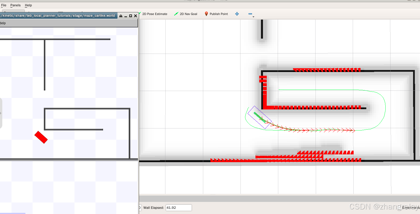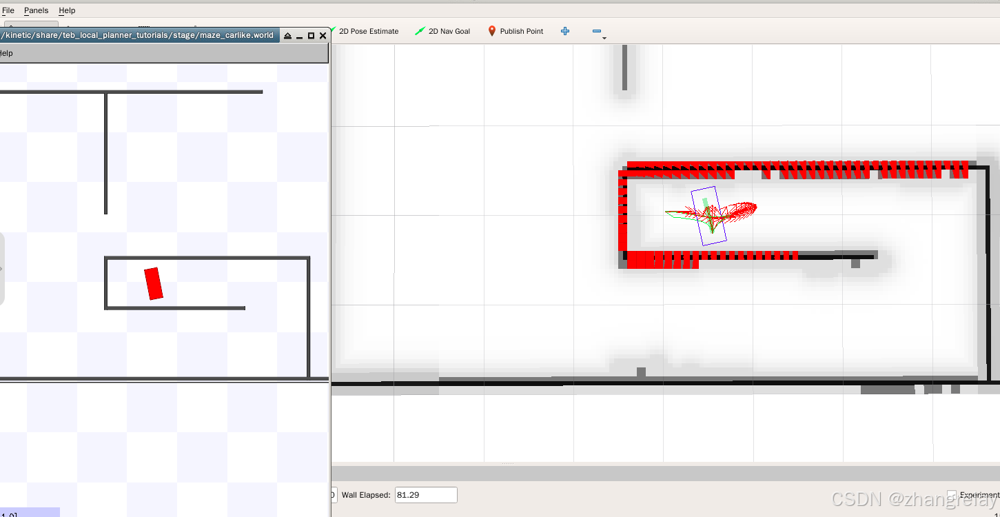 roslaunch teb_local_planner_tutorials robot_carlike_in_stage.launch命令,启动示例场景。 - 该命令会启动多个 ROS 节点,包括 Stage 仿真器、机器人模型、地图服务器、TEB 局部路径规划器以及可视化工具 RViz 等。