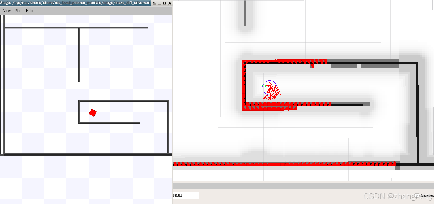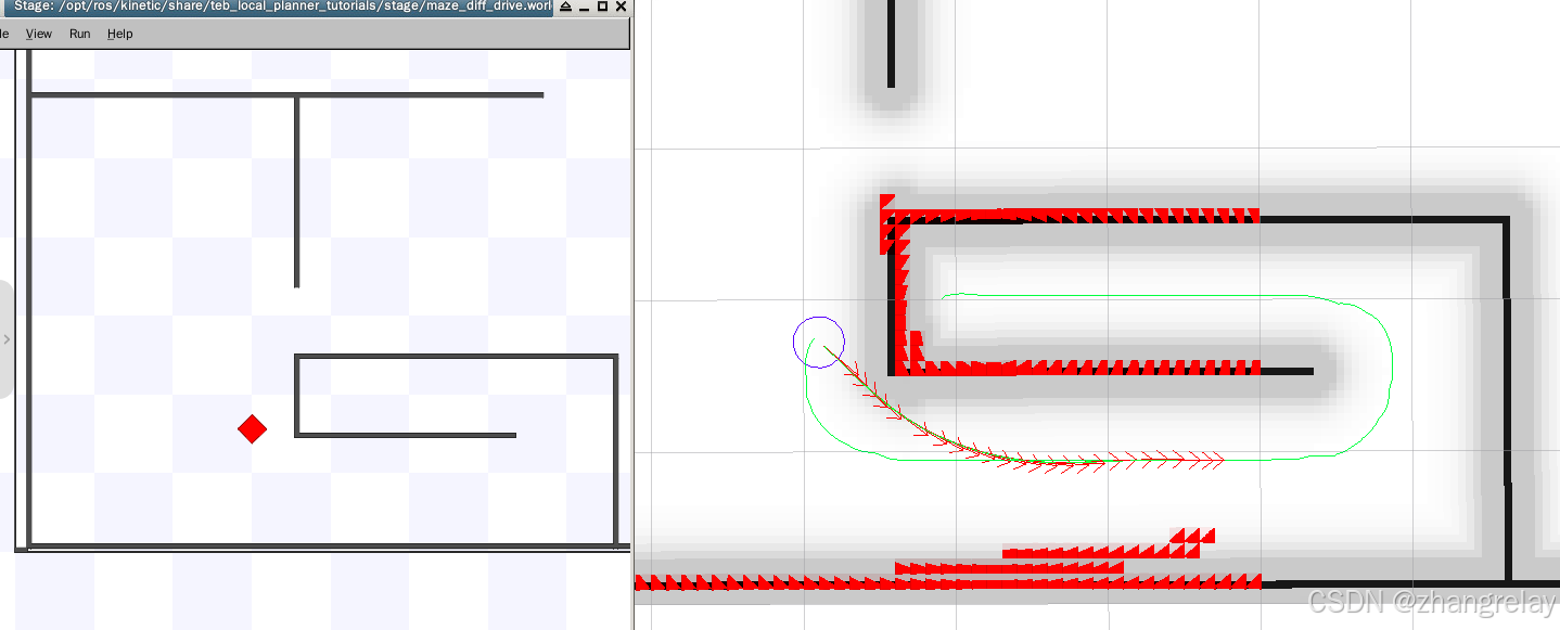 roslaunch teb_local_planner_tutorials robot_diff_drive_in_stage.launch命令,启动示例场景。 - 该命令会启动多个 ROS 节点,包括 Stage 仿真器、机器人模型、地图服务器、TEB 局部路径规划器以及可视化工具 RViz 等。