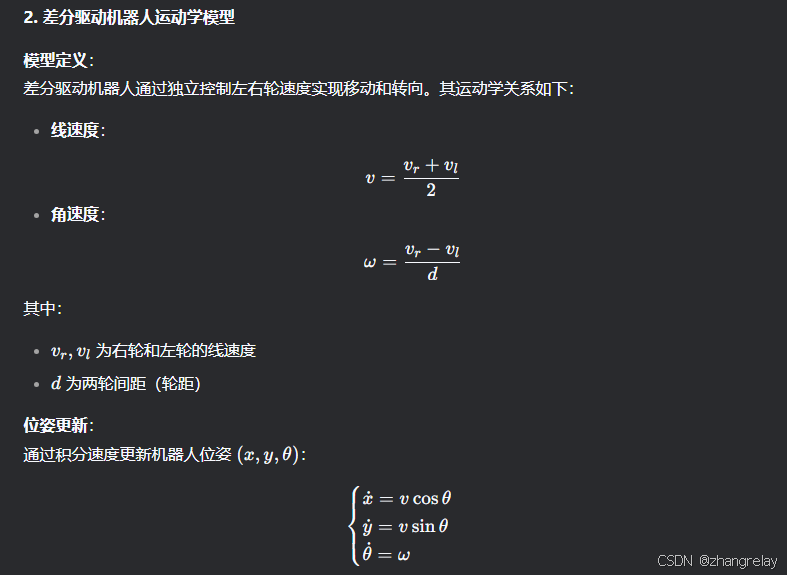 - 差速驱动机器人通过两个独立驱动的轮子实现转向和移动。其运动学模型描述了轮子速度与机器人线速度和角速度之间的关系。