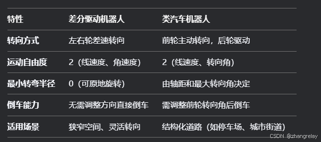 | **特性** | **差分驱动机器人** | **类汽车机器人** |