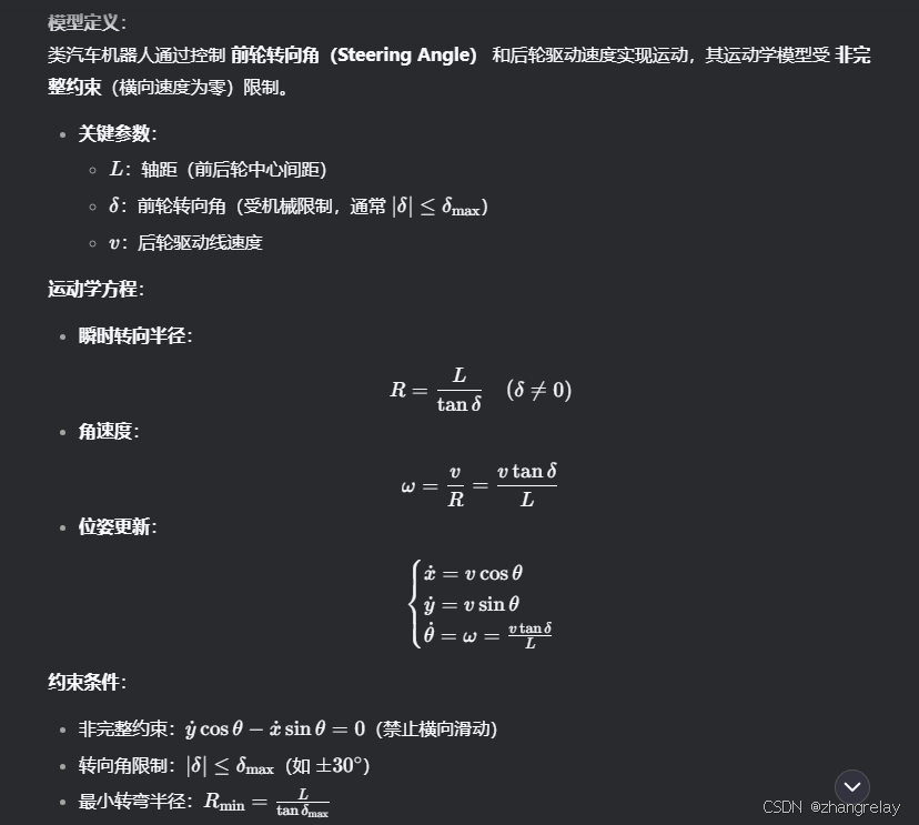 - 汽车模型机器人是一种具有复杂动力学和运动学约束的机器人。其运动学模型描述了机器人轮子的转向角度与机器人行驶方向和速度之间的关系。与差速驱动机器人不同,汽车模型机器人通常需要更多的参数来描述其运动特性。