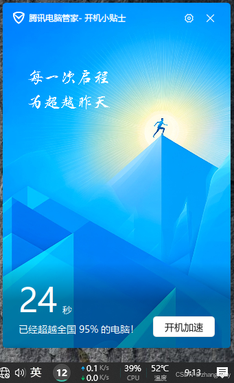 - 开机 24 秒超越全国 95% 的电脑,说明你应该换了固态硬盘(这是老电脑优化的核心效果),启动速度直接从原来的几分钟压缩到了秒级,日常打开软件的响应会快很多;