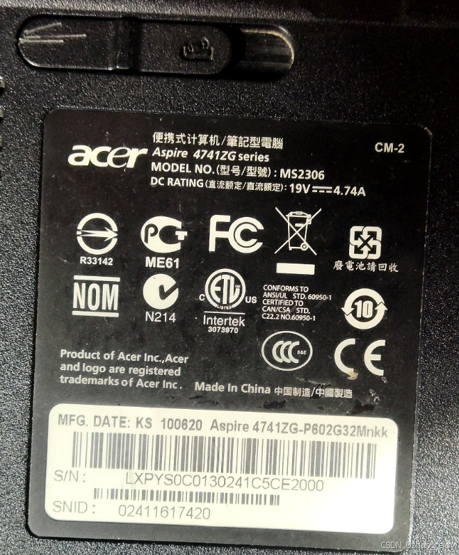 - 生产日期:从 “MFG. DATE: KS 100820” 可知,生产地为 KS(推测为宏碁某生产基地代码),生产日期是2010 年 8 月 20 日。