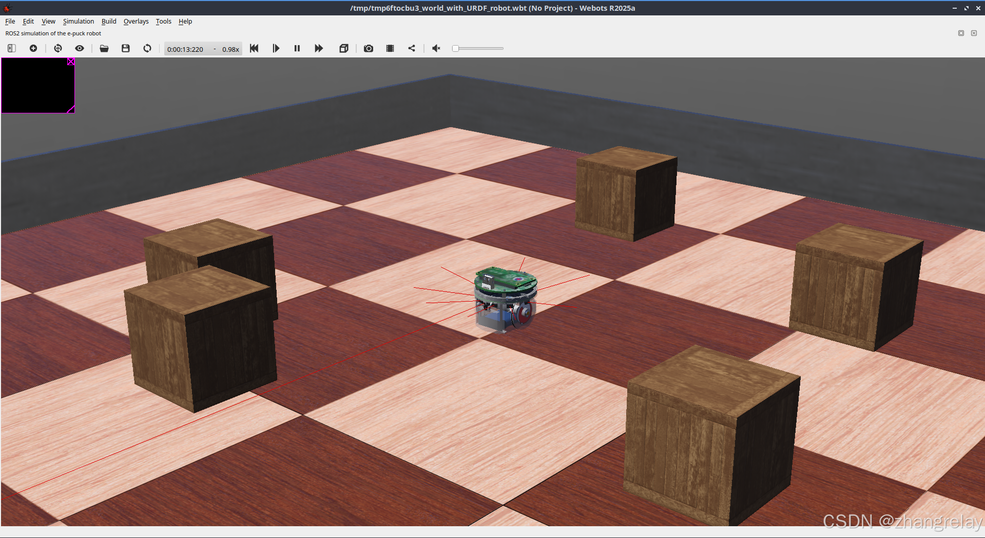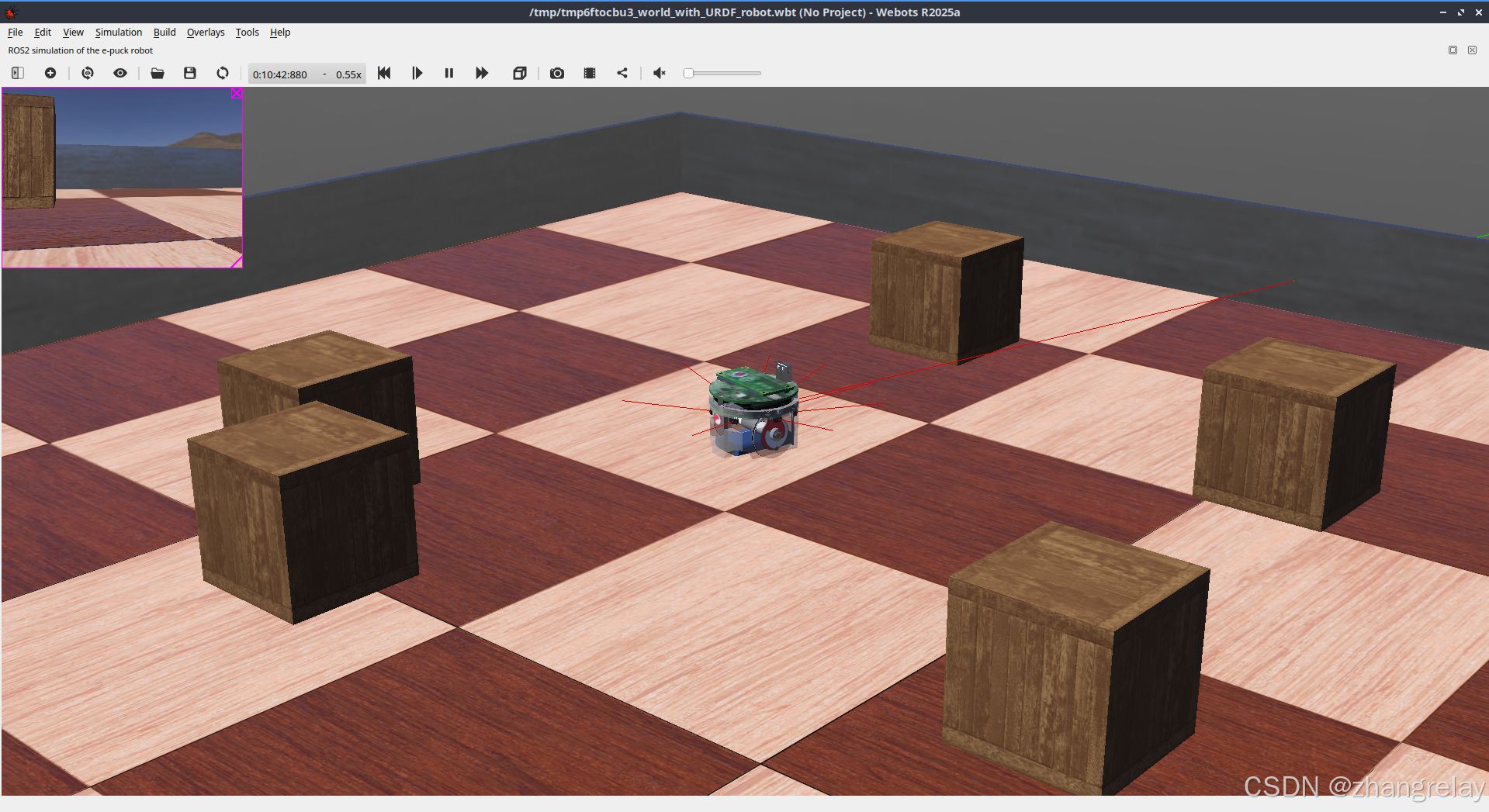 - Webots 2025a 自动启动,界面显示 e-puck 机器人在空场景中;