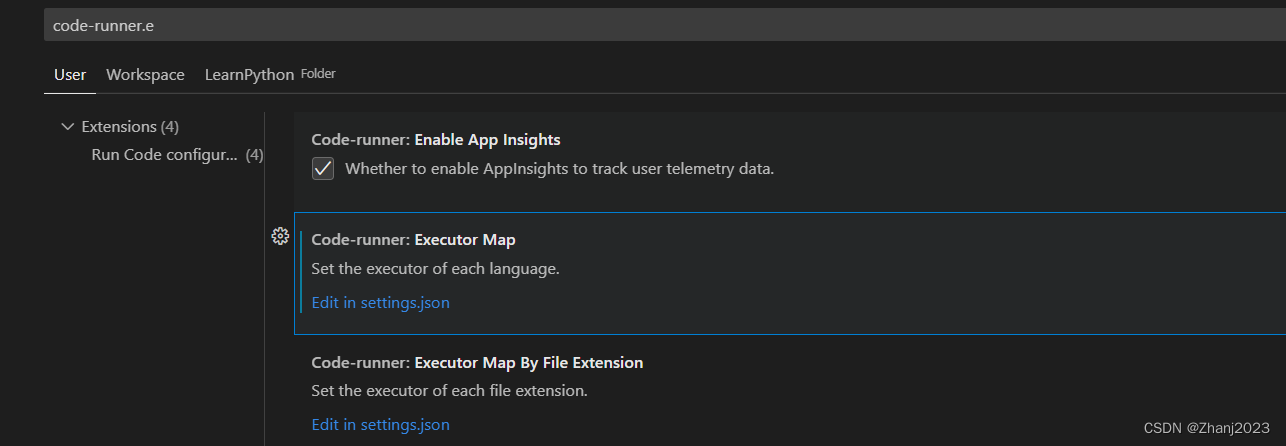 2、修改完后运行仍不行,可以在"文件"-“首选项”-"用户设置"中搜索code-runner.executorMap选项,提示需要在setting.json中修改