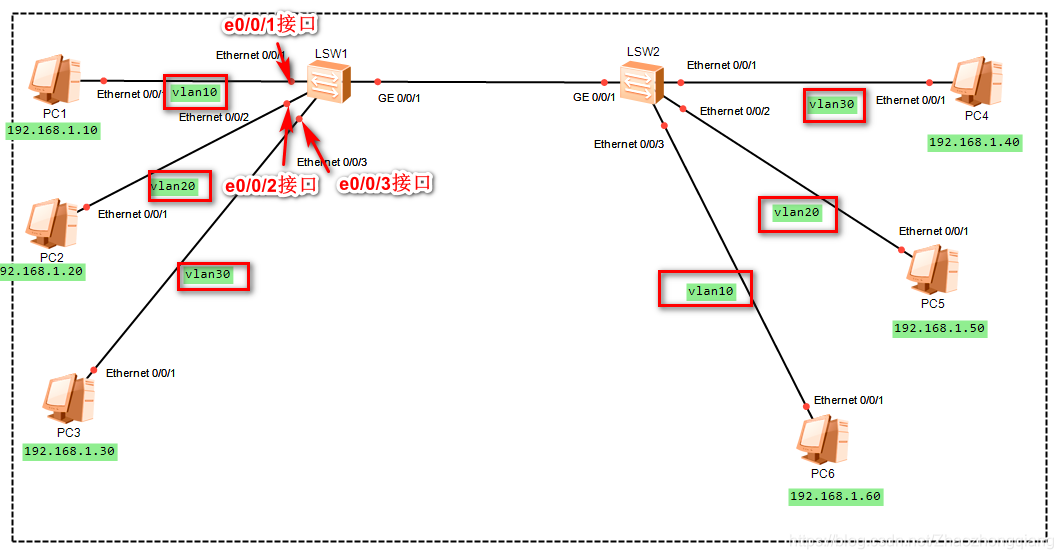 补充:交换机根据连接对象的不同,会有不同的链路类型,交换机的连接对象是电脑,那么接口链路类型为access,注意:access这种类型接口只能属于一个vlan。交换机连接的对象是交换机,那么接口链路类型为trunk,注意:trunk不属于任何vlan,它是一条公有链路,用来在单条链路上承载不同的vlan流量,让其通过。