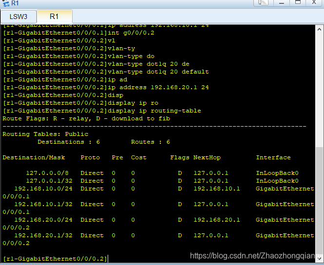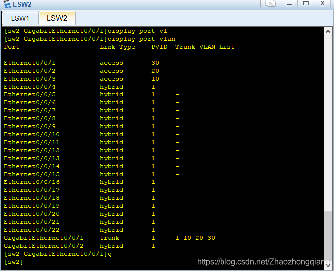 [ ]port default vlan 2 //将g0/0/1划分进vlan 2