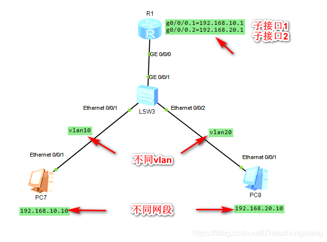 单臂路由技术:当只有二层交换机时,又要实现不同vlan间通信时,需要用到单臂路由技术