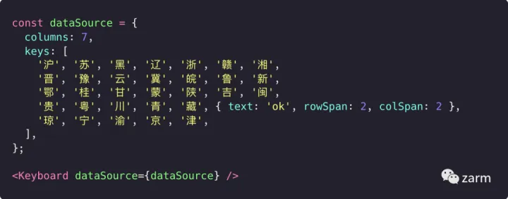 不仅如此,我们同样开放了 Keyboard 源数据自定义的能力,这个功能非常适合那些需要特定的业务场景,比如车牌键盘等等。