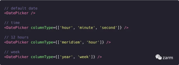 另外,我们对日期组件也进行了改进,移除了内置预设模式,调整为更加灵活的时间类型列进行配置,并且增加了 “周” 时间类型和 12 小时制。