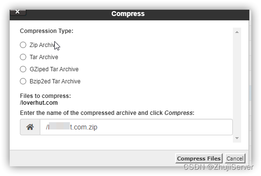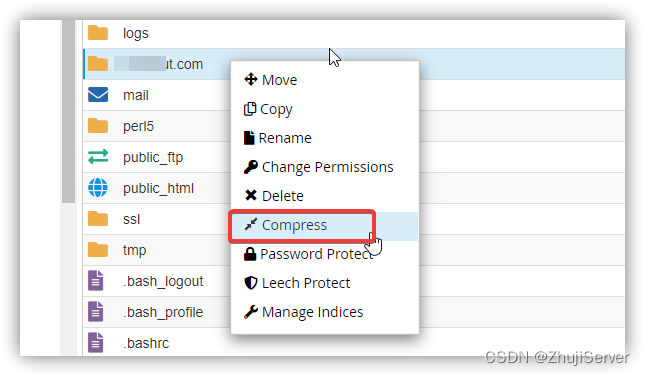 当然还是通过cPanel来操作,我们登录到cPanel面板后,转到“文件”>>“文件管理器”,在主目录下找到该网站对应的文档目录,右键选中该目录,点击压缩: