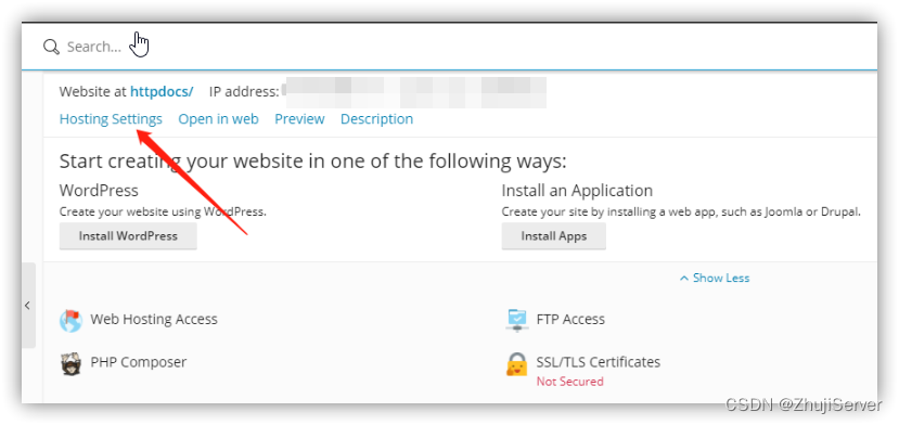 1.先进入主机Plesk面板,点击主机设置即Hosting settings: