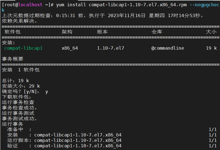 yum install compat-libcap1-1.10-7.el7.x86_64.rpm --nogpgcheck