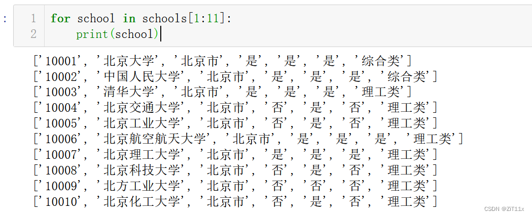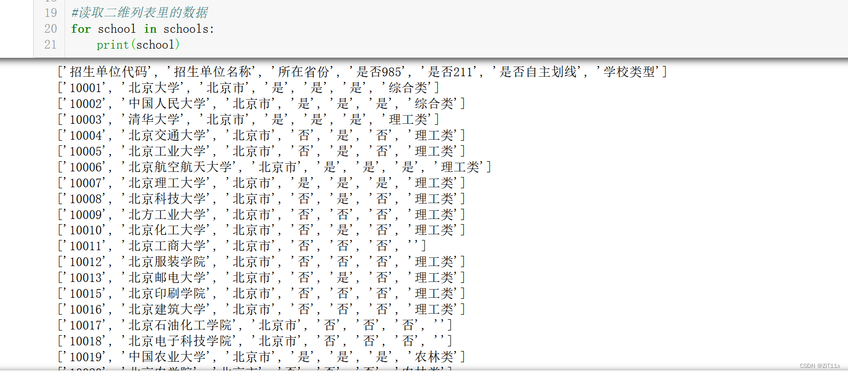 schools.append(school) #将每行的数据追加到二维列表schools里面