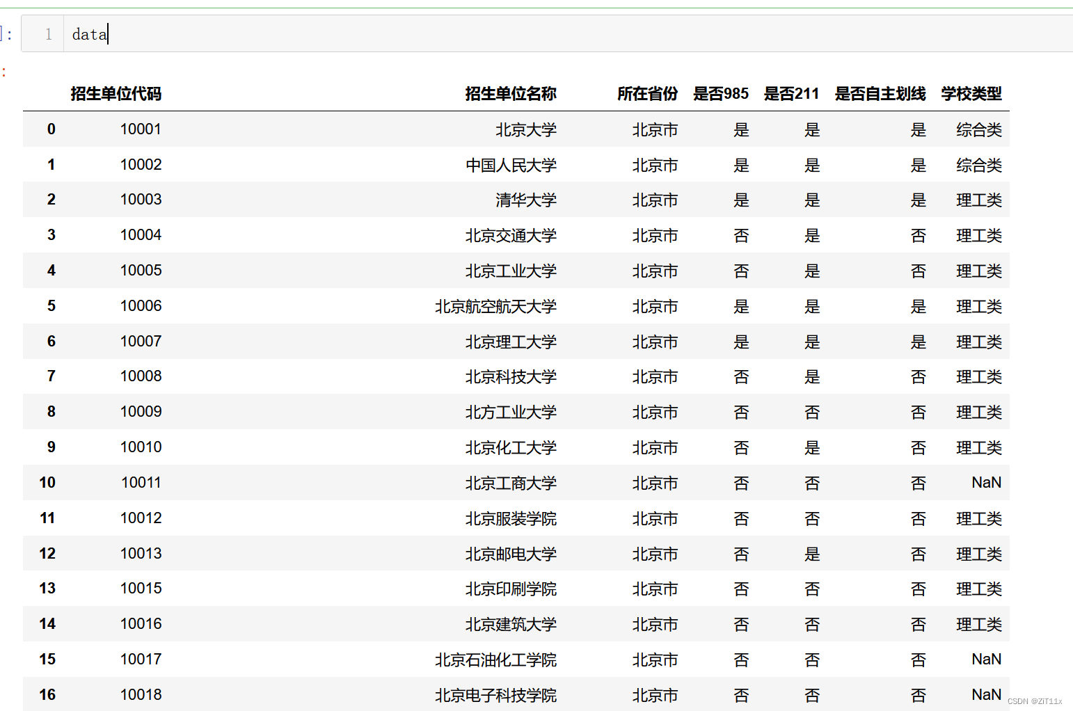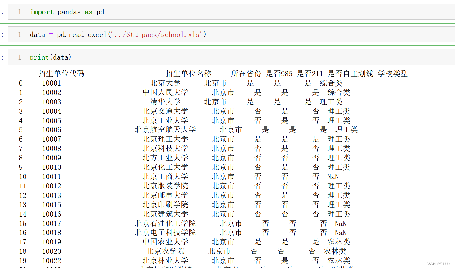 data = pd.read_excel('../Stu_pack/school.xls') #使用pandas库中的read_excel函数读取Excel文件,并将其存储在名为data的变量中