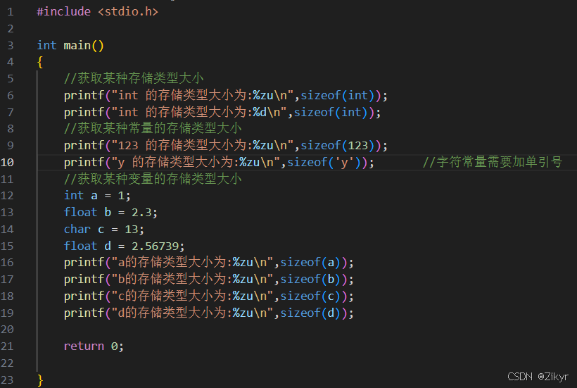 使用sizeof 可以获取数据类型或变量、字面量的存储大小,单位是字节。sizeof返回一个size_t类型的无符号整数值,格式占位符是 %zu,也可以使用%d。