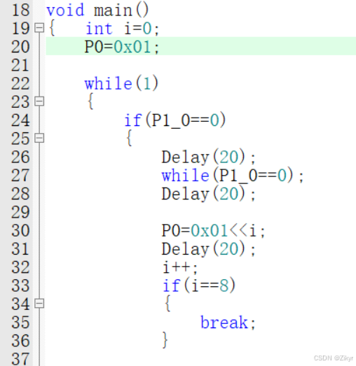 定义一个变量i,通过i++来控制左移位数,最后再设置一个if语句控制i,因为我这块板子上只有7个灯 ,所以我就设置当i=8的时候,跳出循环,使i重新赋值。当这样敲下来代码之和,会遇到一个问题,连接开发板时,第一个的循环的第一个LED灯不亮,是直接从第二个灯开始亮,但是从第二个循环开始,第一个灯才正常。所有第20行代码很重要,首先要在循环开始时先让第一个灯点亮,再去进行循环。好了,独立按键这个章节的初级知识就学完了。