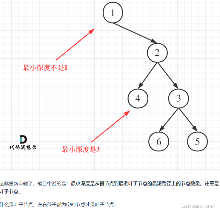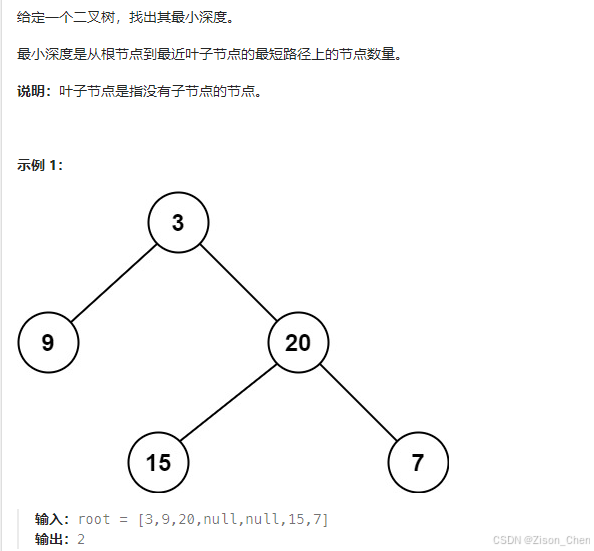 最小深度是从根节点到最近叶子节点的最短路径上的节点数量。注意是叶子节点.
