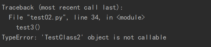 图中创建了一个类TestClass,再实例化了一个对象test3,让test3()这样会报错,因为TestClass2中没有实现__call__()方法,且继承的object类也没有实现该方法,所以这样使用就会报错如下: