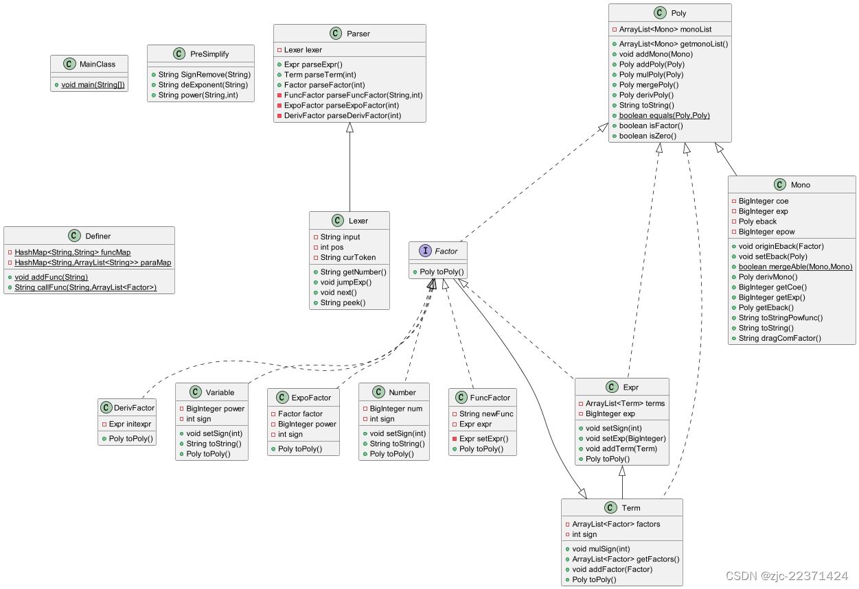 之后我们就可以在Expr、Term、Factor三个层次中分别写一个topoly方法,这里我将具有topoly方法的Factor设置为接口,其中包含因子中的表达式、常量和幂函数因子。从底层到高层,这里也使用了递归的思想。