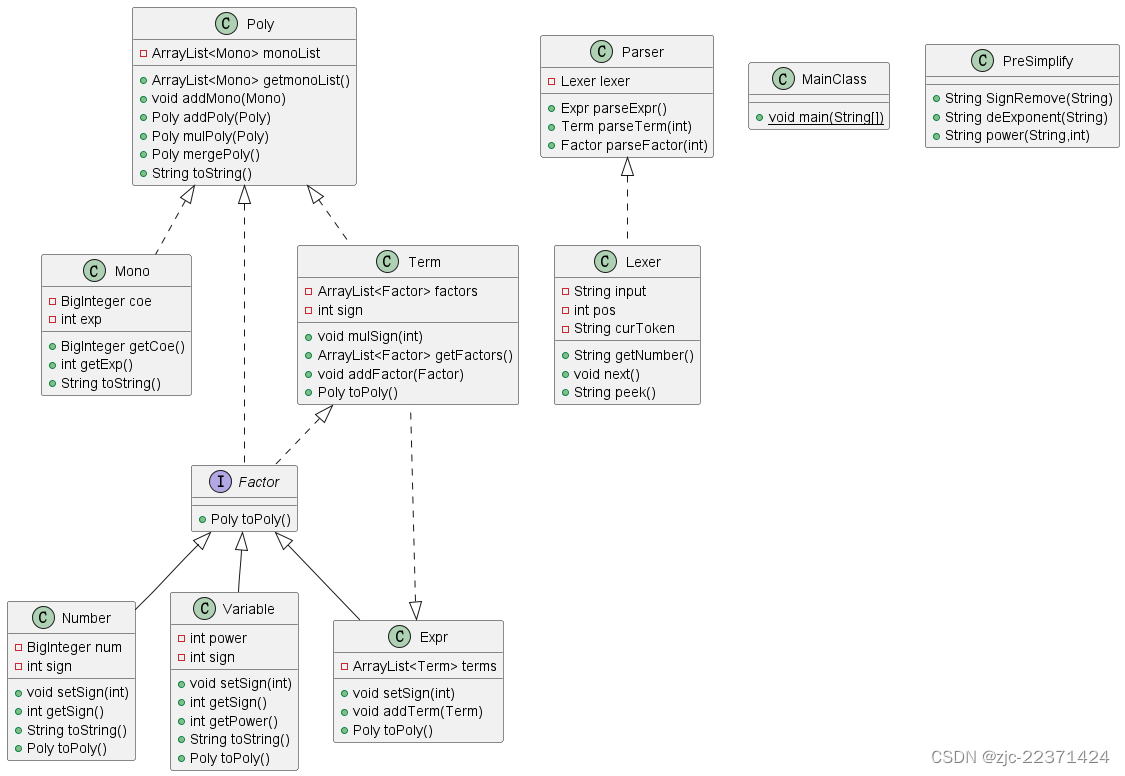 Poly类具有一个Arraylist容器的属性,用来记录其包含的Mono单项式,此外有 addPoly() , mulPoly() , mergePoly() 等方法进行多项式加乘以及合并同类项的运算。toString() 方法可以将Poly中的Mono的字符串连接起来,形成多项式的字符串。