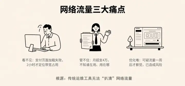 大促高峰,客户付完款却加载不出订单页面,运维团队急得满头汗,查了 2 小时才发现 —— 是行政部的视频会议占了支付系统 30% 的带宽;月底财务对账,网络账单比预算超了 4 万,却没人说清 “谁在用、用在哪”,只能吃哑巴亏;更可怕的是,某天下班后,IT 部突然收到告警,服务器有大量异常数据往外传,追溯时才发现,一周前就有可疑流量,但没人及时察觉……