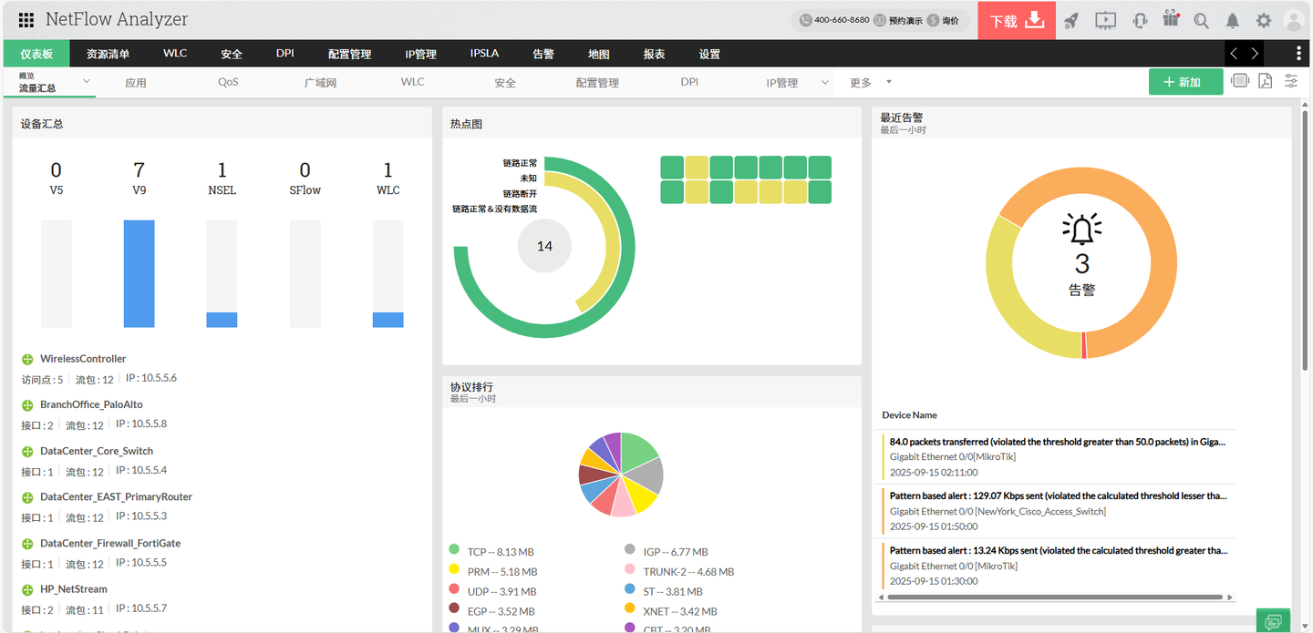 想要轻松搞定带宽控制,光靠手动操作远远不够。NetFlow Analyzer 作为专业工具,能通过流量监控、网络流量分析与智能管控,帮企业实现 “全流程带宽优化”,核心能力包括: